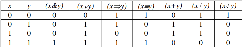 Функция (x&y) называется конъюнкцией x и y. Выражение «(x&y)» читается «x и y» и эту функцию можно интерпретировать как соединение двух высказываний x, y с помощью союза «и».