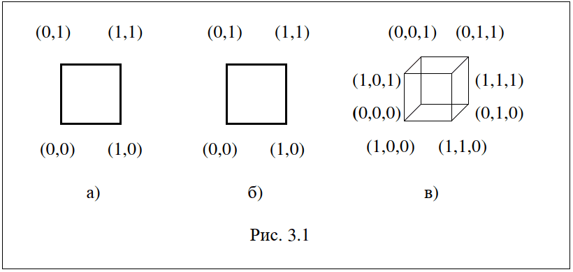 Булеву функцию можно задать с помощью таблицы, формулы (аналитически), графика и т.п. Графически булеву функцию $f(x_1,x_2,...,x_n)$ задают с помощью n-мерного куба следующим образом. Считаем наборы значений переменных $x_1,x_2,...,x_n$ вершинами n-мерного куба. Те вершины, на которых булева функция равна единице, помечаем точкой или звездочкой, остальные вершины оставляем без пометок. Например, функции (x⇒y), (x≡ y) и (x⇒(y&z)) можно представить их графиками, как на рис. 3.1 а, б и в соответственно.