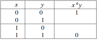 Далее выясним, чему равняется 0° 0. Если бы 0° 0 = 0, то любая формула, построенная с помощью только лишь °, принимала бы значение 0, когда значения переменных равны 0. Следовательно, формула x не могла бы быть выражена только через °. Поэтому 0° 0 = 0. Таким образом, имеем таблицу: